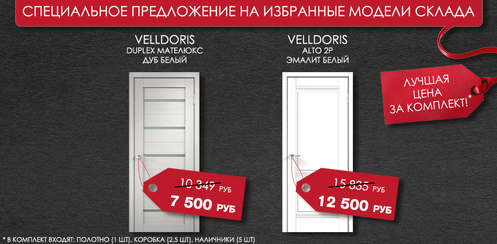 - Фиксированная цена на дверь действует только при покупке комплекта. В комплект входят: полотно (1 шт), коробка (2,5 шт), наличники (5 шт).